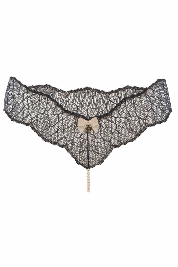 Sexy and suggestive, discover the Sydney single thong, connecting luxury lingerie with jewellery, sensuality with pleasure. Made by the renowned erotic lingerie brand Bracli, this seductive thong combines black Italian lace highlighted by gold lurex with a string of strategically-located black Manacor pearls, to create sexy lingerie that is quite literally a pleasure to wear. Style yours with one the matching Sydney bras or slip dress for an alluring look.