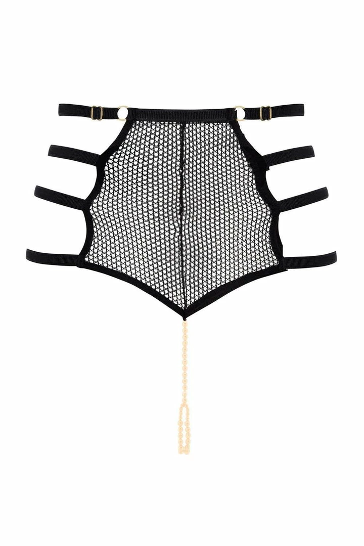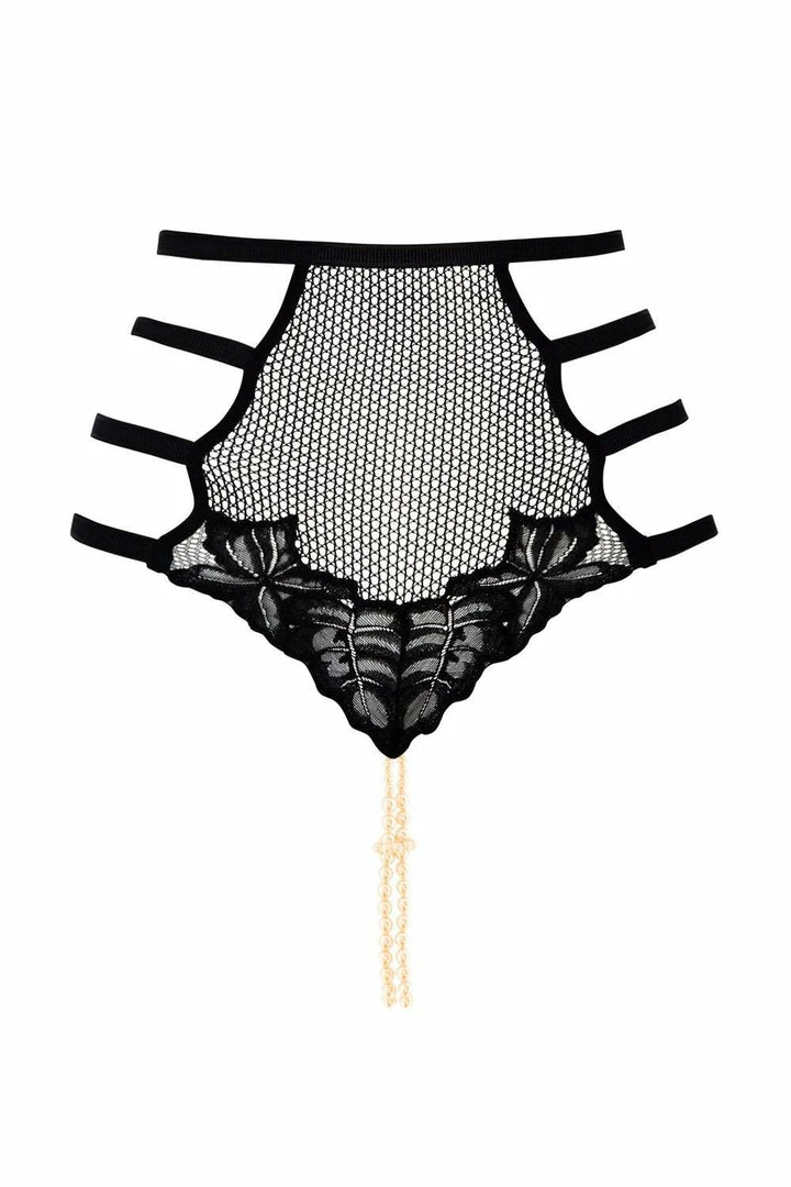 Pearl thong by Bracli. Caress your skin with luxury Leavers lace and sheer mesh. The London High Waist Brief features black straps which contour your hips and is complete with Bracli’s signature double strand of pearls, with which you can get two different sensations: stimulation for women and both partners in a sexual relationship. Style with black hold-ups and the matching bra for a tempting look.