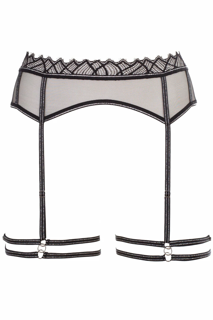 Accentuate your natural curves with the Manhattan harness garter by Bracli. This luxury 4-strap harness is crafted from black recycled Italian lace, transparent tulle and elastic bands enhanced with lurex. Silver lurex elastics wrap around your body and frame your curves to perfection. Adjustable straps add flexibility to the sizing and allow for a personalised fit. Complete this irresistible black lingerie look by wearing it with the Manhattan peek bra and g-string.