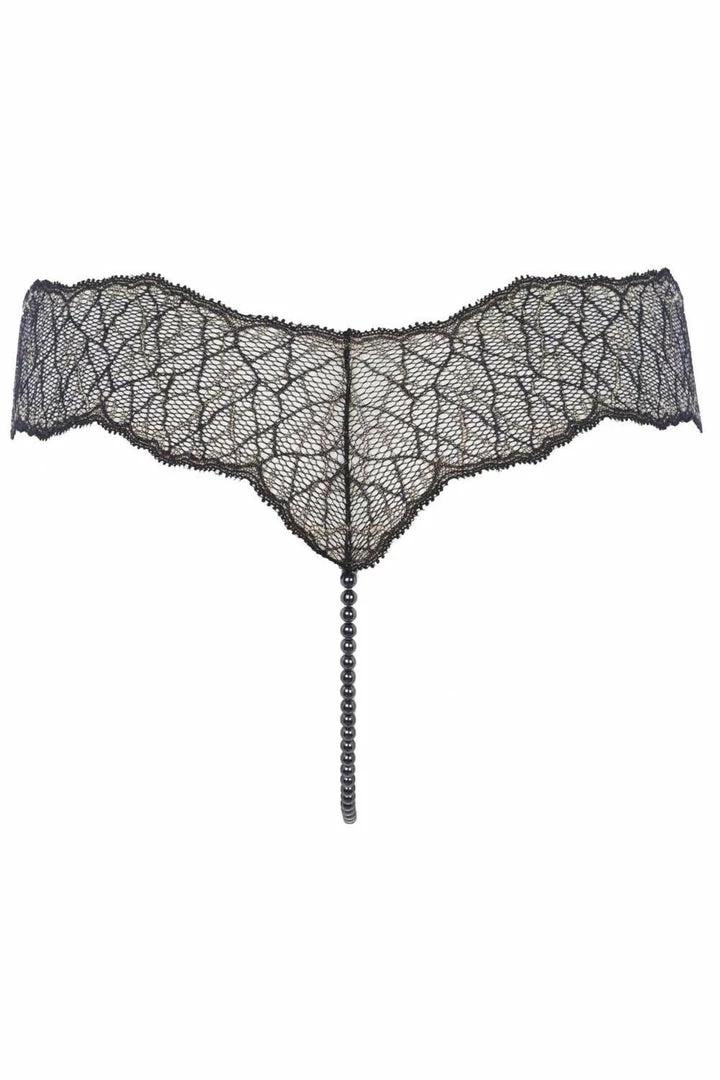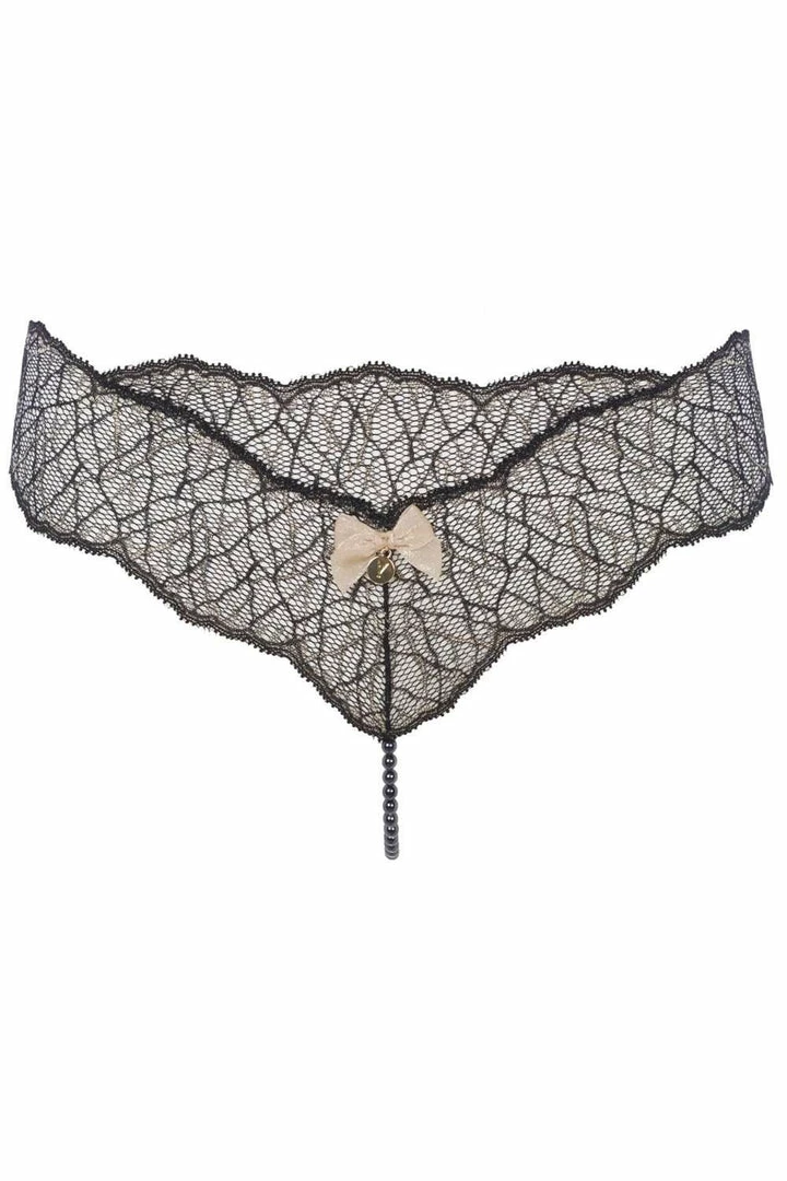 Sexy and suggestive, discover the Sydney single thong, connecting luxury lingerie with jewellery, sensuality with pleasure. Made by the renowned erotic lingerie brand Bracli, this seductive thong combines black Italian lace highlighted by gold lurex with a string of strategically-located black Manacor pearls, to create sexy lingerie that is quite literally a pleasure to wear. Style yours with one the matching Sydney bras or slip dress for an alluring look.