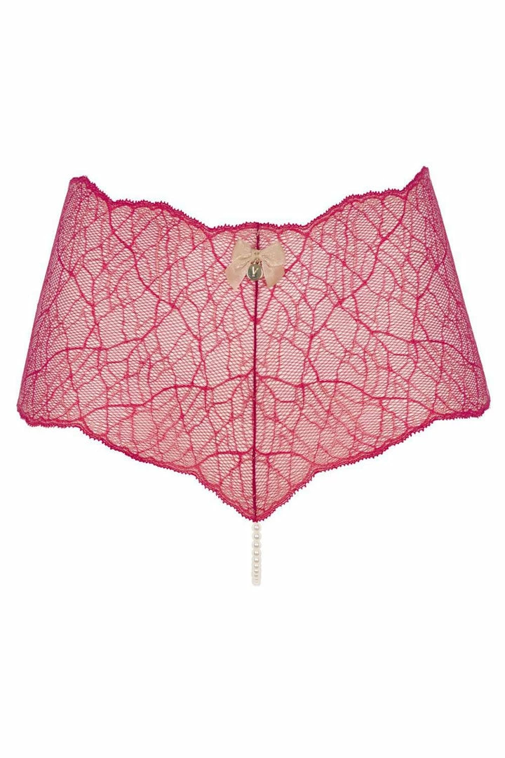Sexy and suggestive, discover the Sydney panty, connecting luxury lingerie with jewellery, sensuality with pleasure. Made from red Italian lace highlighted by gold lurex it features a wide lace design for a high waisted silhouette. The cream Manacor pearls stimulate the most sensitive body parts of women thanks to a strategical collar located at the bottom of the garment, which makes it both a pleasure to wear as it is for the eyes. Style yours with one the matching Sydney bras and glove for a seductive statement.