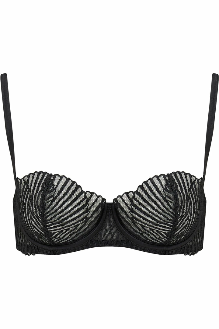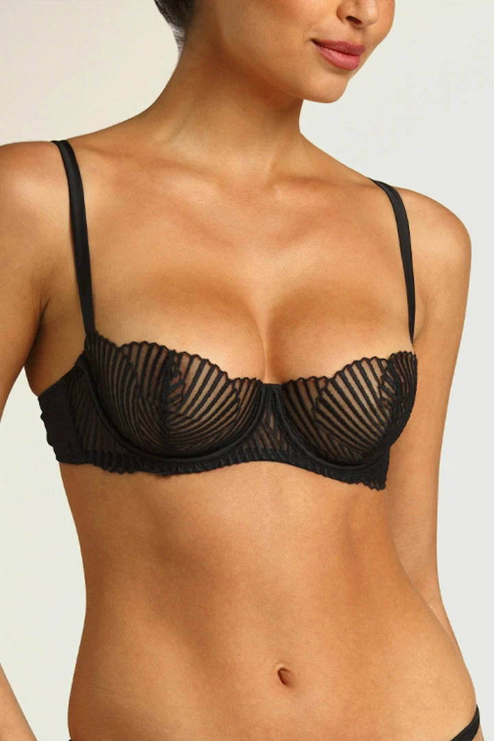 Adorn your bust with the finest embroidery in the Athena bra by Agent Coco de Mer. This underwired balconette bra features supportive vertical seaming. The cups and band are made from alternating panels of bespoke fan embroidery and soft jet black silk. Pair it with the Athena brief for everyday elegance, or the Athena open thong in the boudoir.