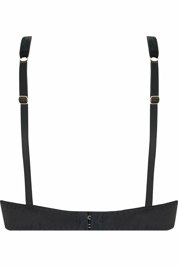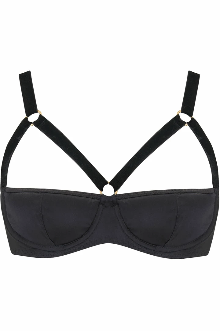 Adorn your bust with the finest fabrics in the Persephone bra by Coco de Mer. This underwired balconette bra features velvet strapping that rises from the half style silk cups to form a cleavage-framing apex. It’s finished with shimmering O-ring embellishments for an eye-catching look. Complete this bold bondage-inspired lingerie set with the matching Persephone Brief and Suspender Belt.