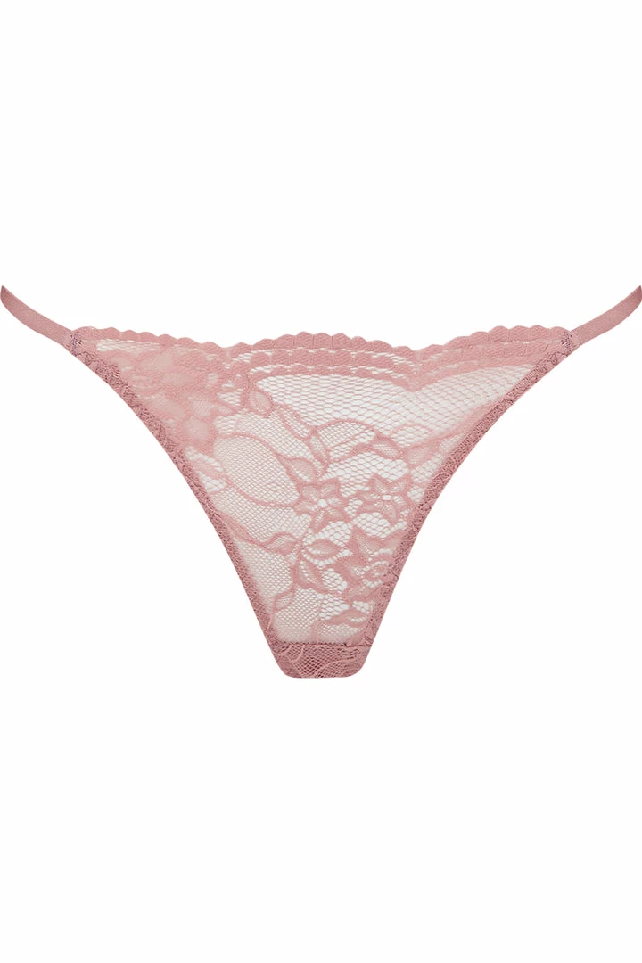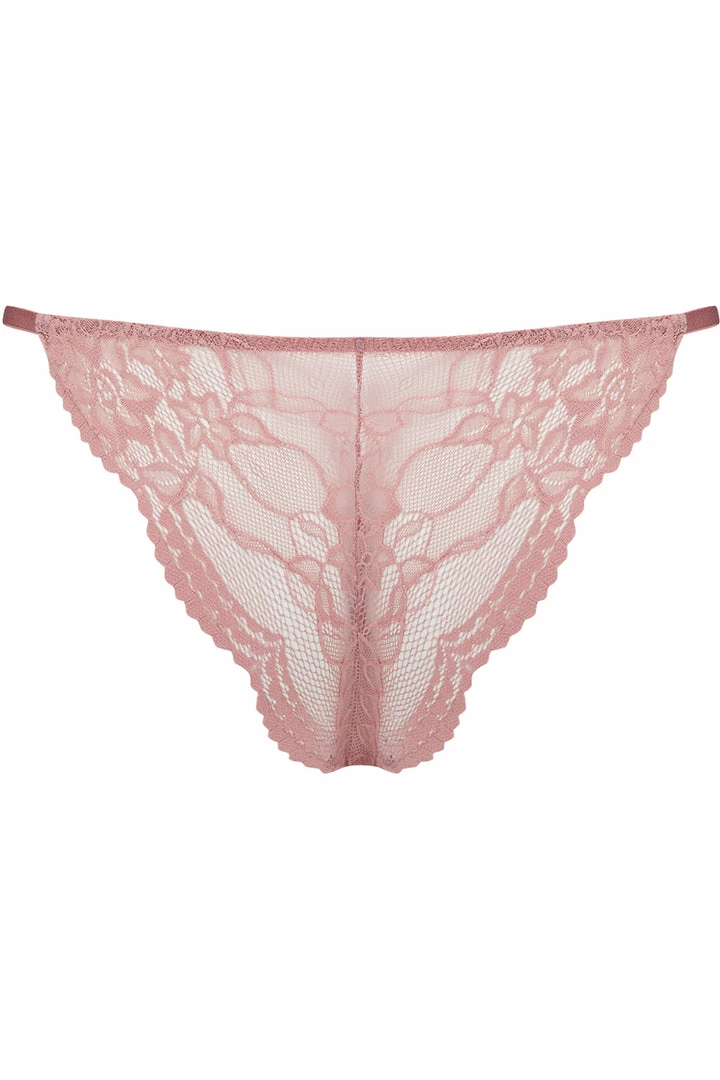 Indulge your love of lace lingerie with the Alice Brazilian Knicker by Coco de Mer. Crafted from soft pink floral lace and elastic strapping its unique style, and elegant scallop trim will emphasize your curves to perfection. Complete this luxury lingerie set with the matching Alice Plunge Bra or Triangle Bra.