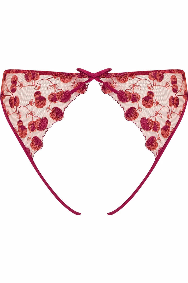 Be unapologetic sexy and playful in this temping open brief from Coco de Mer. Crafted cherry detailed embroidery on sheer mesh, it features soft satin trim. The crotch and back are open to highlight and showcase your best ‘ass’ets. Match yours perfectly with the Naomi Underwired Halter Bra.