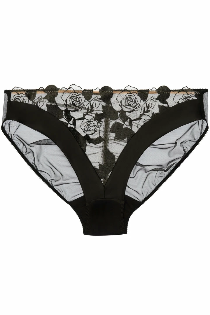 The Dita Von Teese Rosabelle brief is a must-have for any black lingerie lover. At the front it features soft barely-there mesh with refined floral embroidery, that’s simply stunning. It’s trimmed with satin banding and features a black stretch mesh at the rear. Pair with the matching Rosabelle Bra and Suspender Belt for a stunning, chic look.