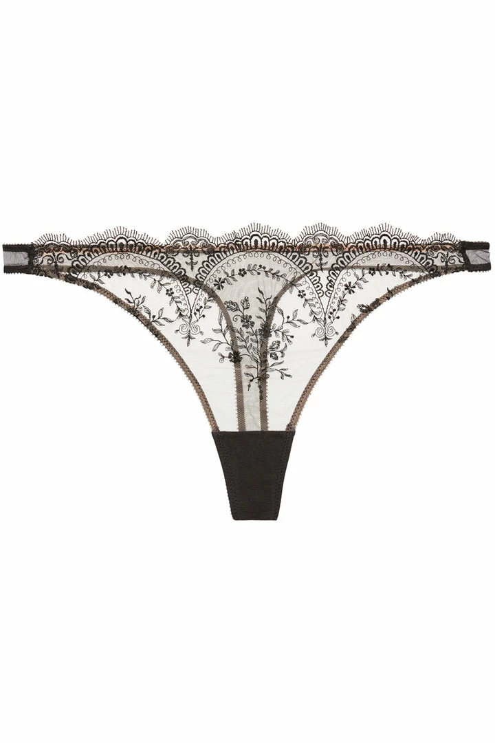 The Severine Tanga thong plays seductive games, combines delicate embroidery with sheer tulle. The front features floral black embroidery on barely-there tulle. At the back, it features a simple soft black mesh and a thong cut. Pair with the matching Severine Underwired Bra and Suspender Belt for a stunning, three-piece lingerie set.