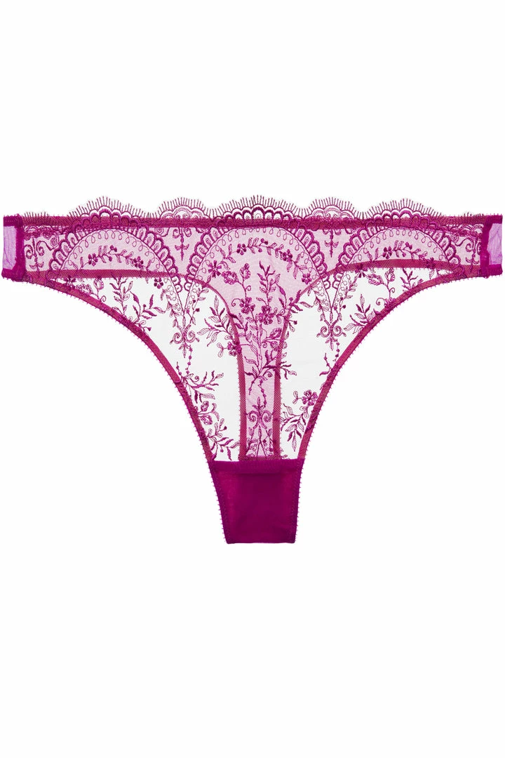 The Severine Tanga thong plays seductive games, combines delicate embroidery with sheer tulle. The front features floral embroidery on barely-there tulle. At the back, it features a simple soft mesh and a thong cut. Pair with the matching Severine Underwired Bra and Suspender Belt for a stunning, three-piece lingerie set.