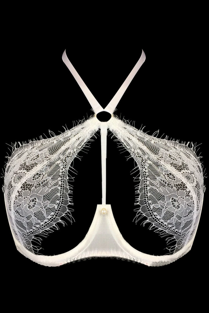 Inspired by 60’s silhouettes and feminine flourishes, the ‘Chantilly Vanille’ bra brings together bondage styling and luxurious craftsmanship. This open bra’s design features a statement neckline with sheer floral lace contrasting with a pure Italian silk underbust. A gold ring at neckline with eyelash fringed scallops down over to bust and a freshwater pearl in the centre for the most irresistible look.