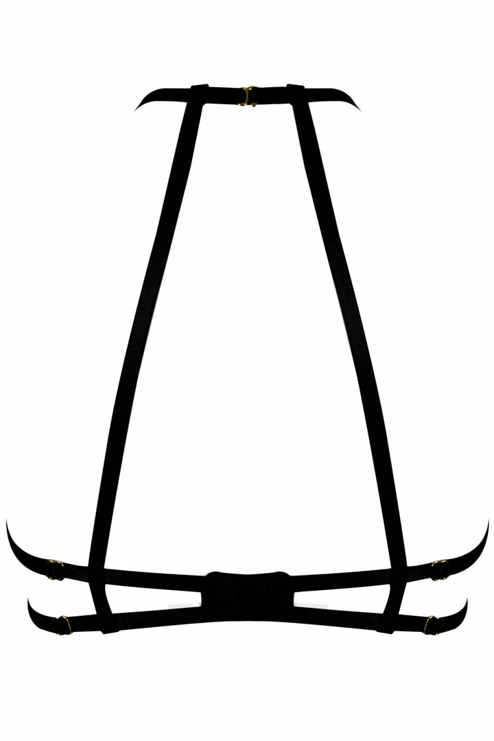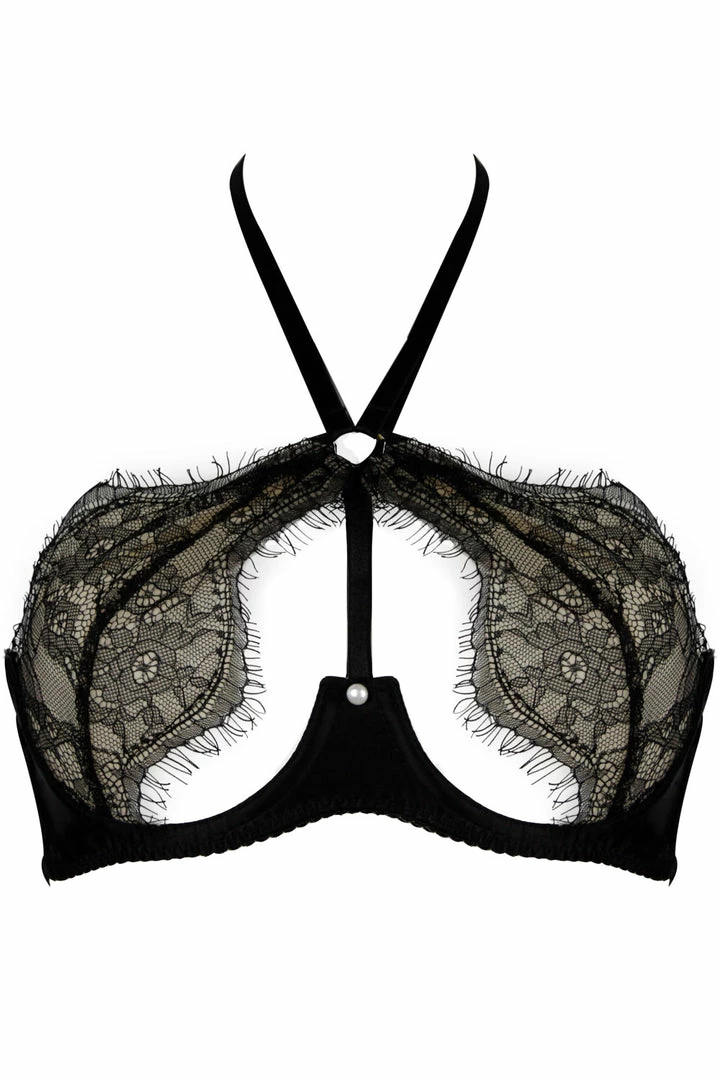 The striking ‘Meteorite’ bra brings together bondage styling and luxurious craftsmanship. This open bra’s design features a statement neckline with sheer floral lace contrasting with a pure Italian silk underbust. A gold ring at neckline with eyelash fringed scallops down over to bust and a freshwater pearl in the centre for the most irresistible look.