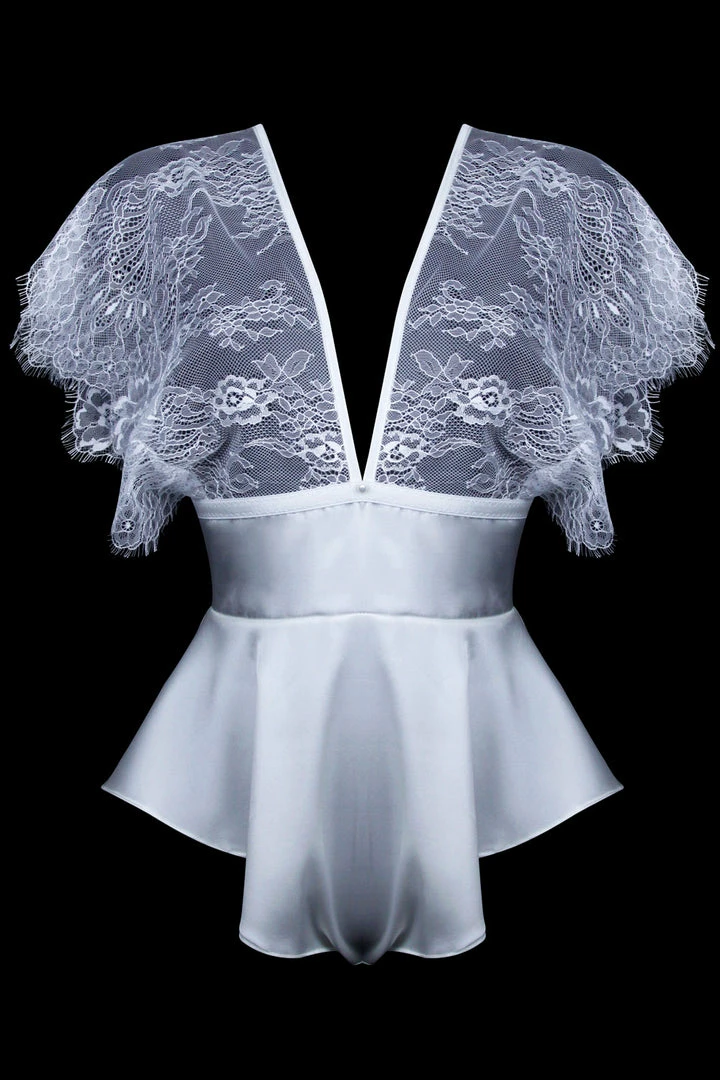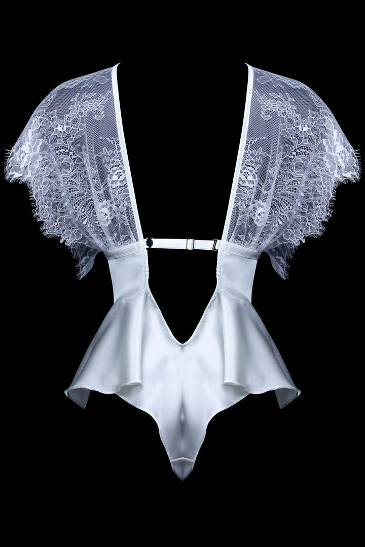 Channel timeless romance in the ‘Chantilly Vanille’ collection. Made from Chantilly lace and Italian silk in a teddy silhouette, this statement piece highlights your bust and shoulders with sensual transparency. The soft silk flows along the bottom for a timeless and romantic look. This sweet yet sexy body can be worn behind closed doors on its own, or layered under jeans for a playful outerwear ensemble.