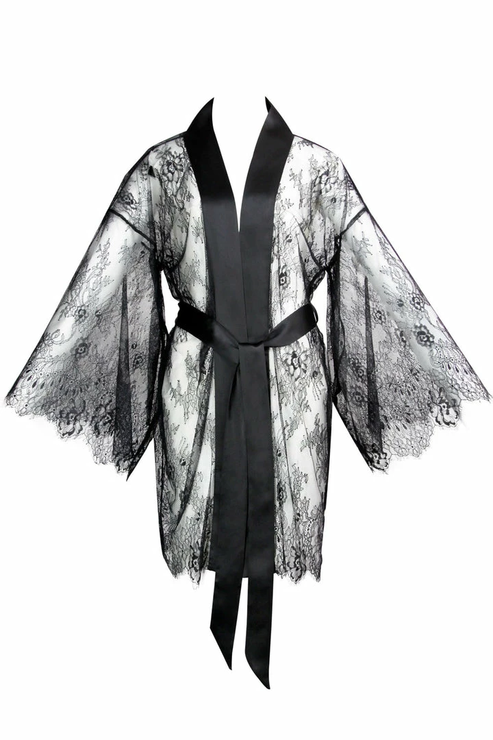 A key piece in the Meteorite line, this robe combines the softness and finesse of floral lace and silk. The transparent fabric shows a glimpse of the skin for a very elegant and glamorous effect. It has beautifully draped sleeves and a silk ribbon tie which can be removable depending on your mood.