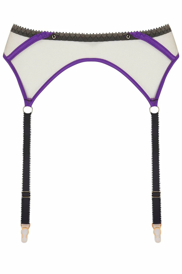 Accentuate your curves with the Barbie suspender belt by Edge o’ Beyond, a luxury 4-strap suspender belt crafted from sheer tulle, purple satin and 24k gold plated hardware. It sits at the natural waistline and is deep enough to provide a secure fit that will keep your stockings up throughout the day. Silk strapping frames the edges and wrap around the body, while a hook-and-eye closure at the back adds flexibility into the sizing. Pair yours with the matching sheer brief and hi apex bra for maximum impact.