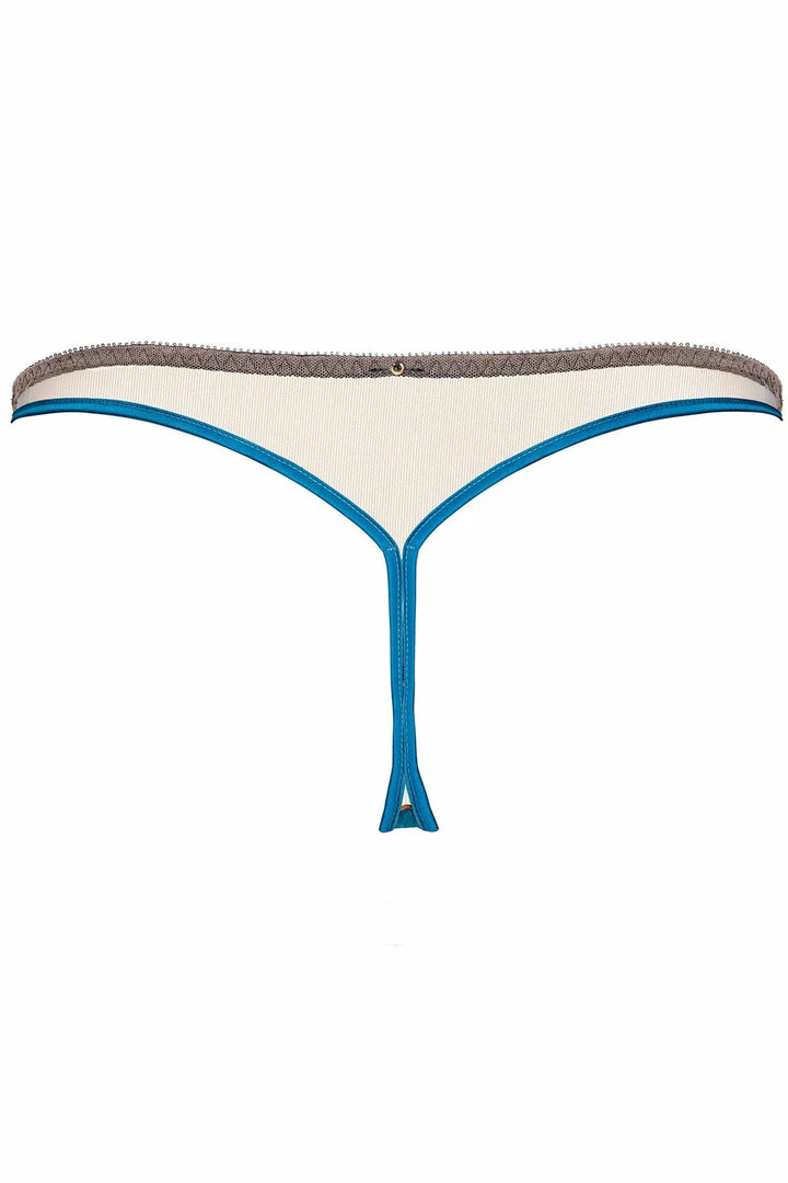 Set the mood in luxurious sheer lingerie with this barely-there thong. Crafted in the UK from Edge o’ Beyond’s signature illusion tulle with striking peacock blue silk bound edges, this irresistible thong features a low rise cut, narrow sides, and cheeky thong back for an unbelievable sexy effect. Complete this striking, luxurious lingerie look by wearing it with the Barbie bra and suspender belt.