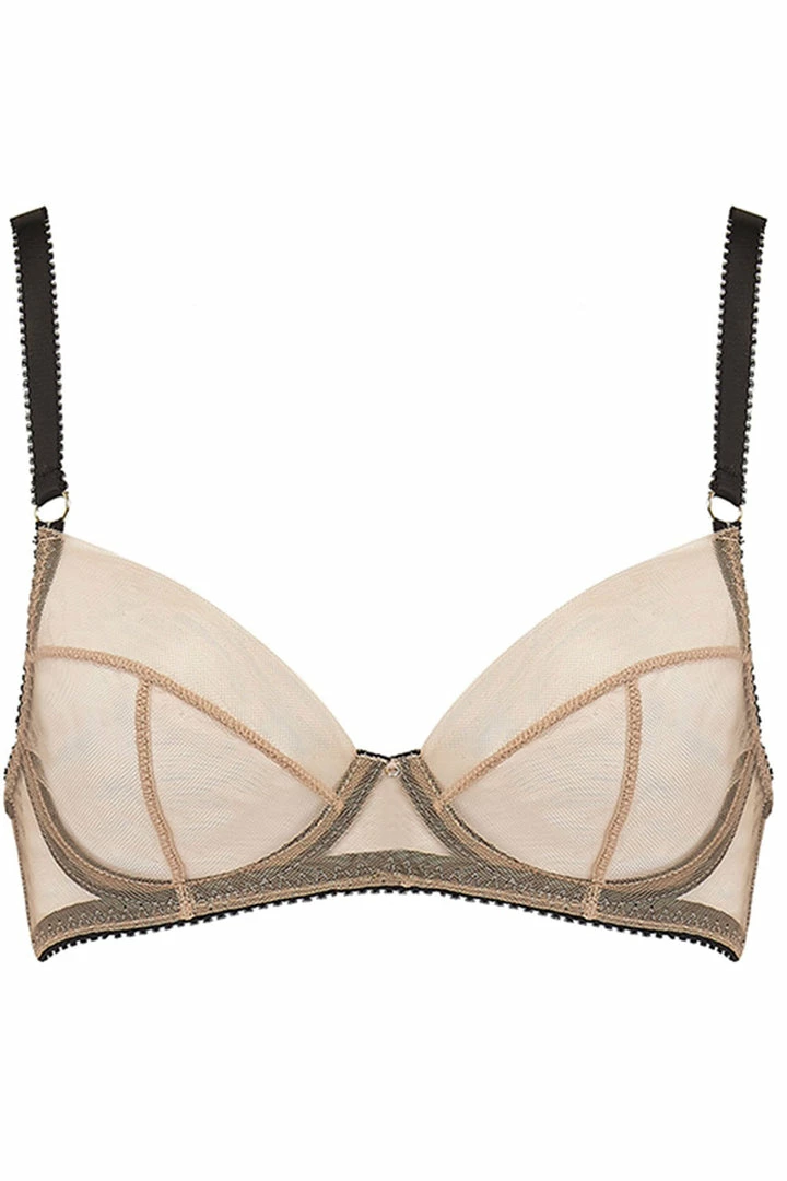 Indulge in luxury with the Marinette collection from British lingerie brand Edge o’ Beyond. This underwired bra is crafted from sheer illusion tulle, black silken crown edged strapping and finished with 24k gold plated hardware. Style yours with the matching brief and suspender belt from the Marinette collection for a sensational look.