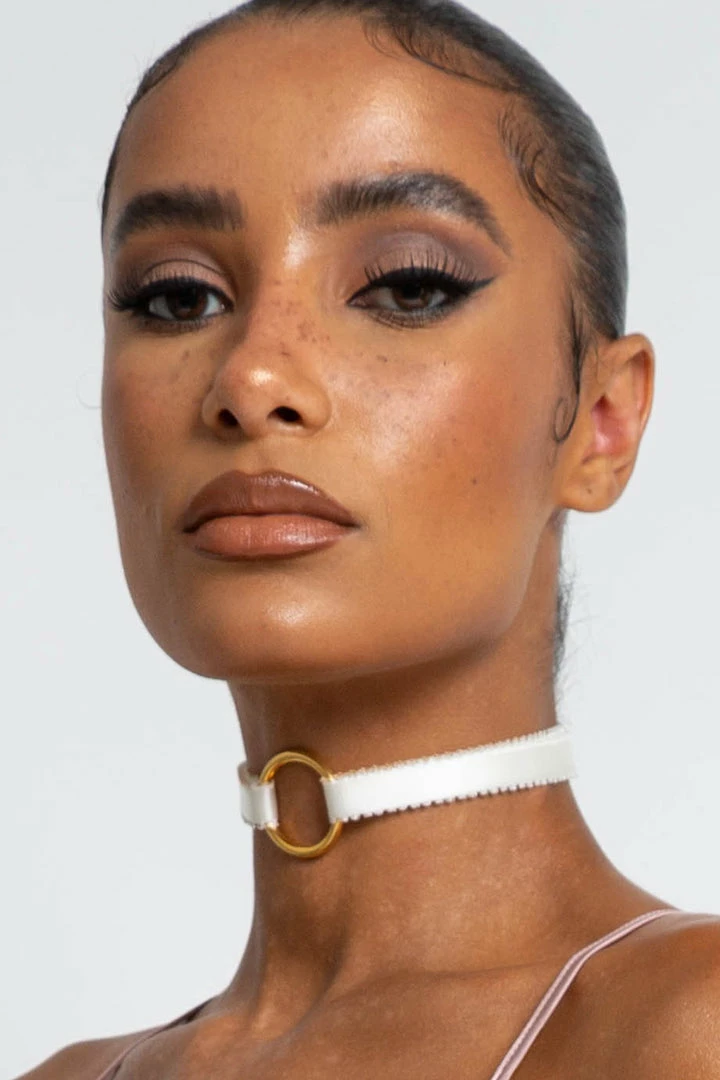 Discover the O’ Choker from Edge o’ Beyond. The ultimate accessory for any luxury lingerie lover, this choker features a single ivory silken strap, embellished with a 24k gold plated ring and sliders. The perfect accessory not only for inside the boudoir. Pair yours with your favourite Edge o’ Beyond lingerie pieces.