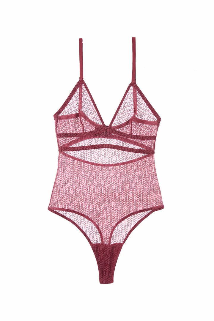 If you love lingerie with minimalist but chic details, this bodysuit is your perfect choice. Crafted from orchid sheer mesh with a honeycomb pattern it features soft triangular cups, a thong cut and adjustable straps for the perfect fit.