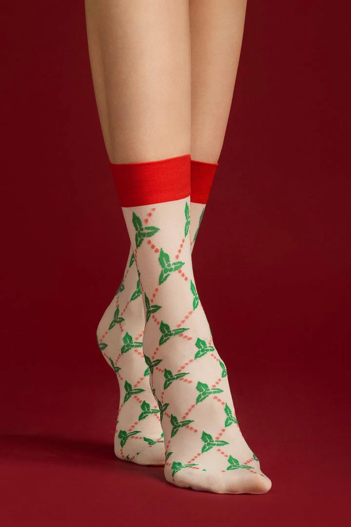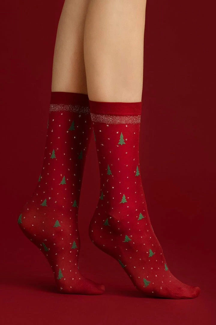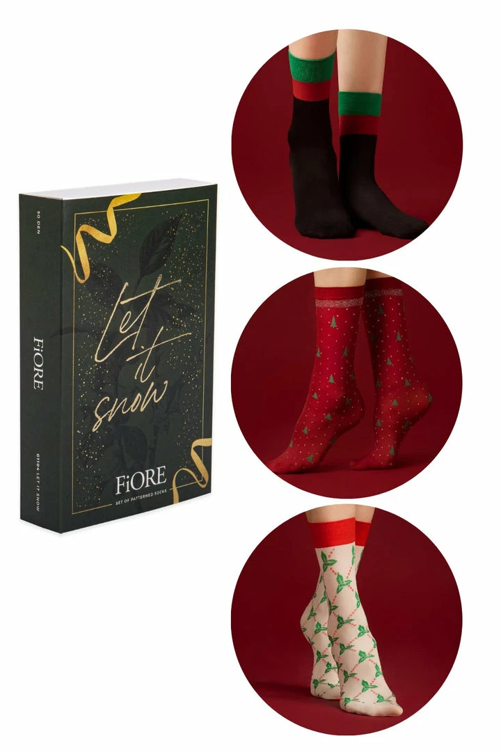 A magic set of socks. Get a triple Christmas inspiration! Delicate holly leaves, Christmas trees on a red background with little dots sparkling like snowflakes and a silver border on the welt and also an expressive model of socks in three saturated colours. When it’s snowing outside, stay chic and try all the festive variants.