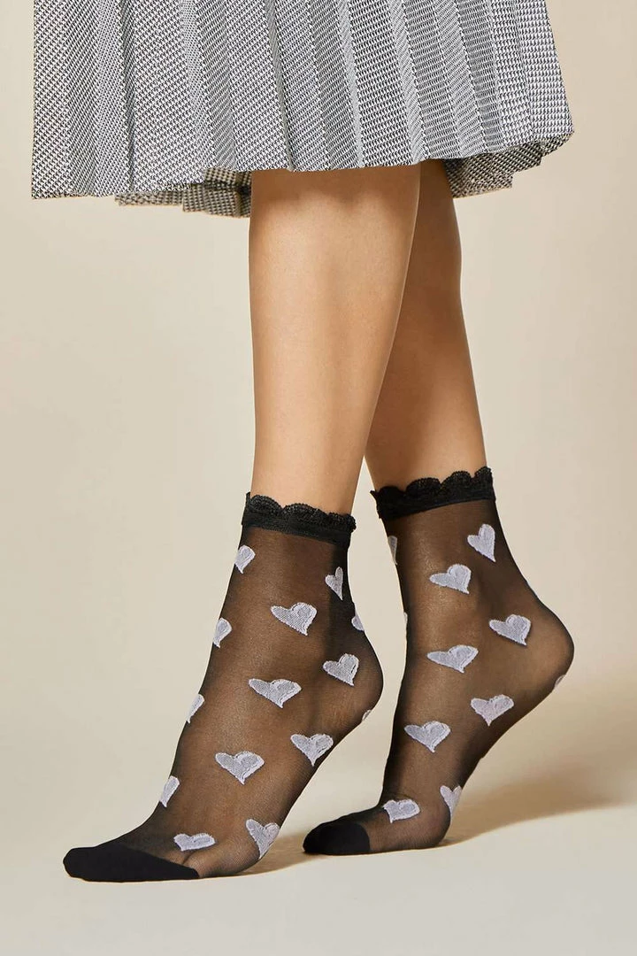 Patterned socks from FiORE’s ‘Femmes’ collection. A feminine & romantic black socks feature delicate lilac hearts & a decorative lace top! We love these socks styled with summer dresses & skirts!
