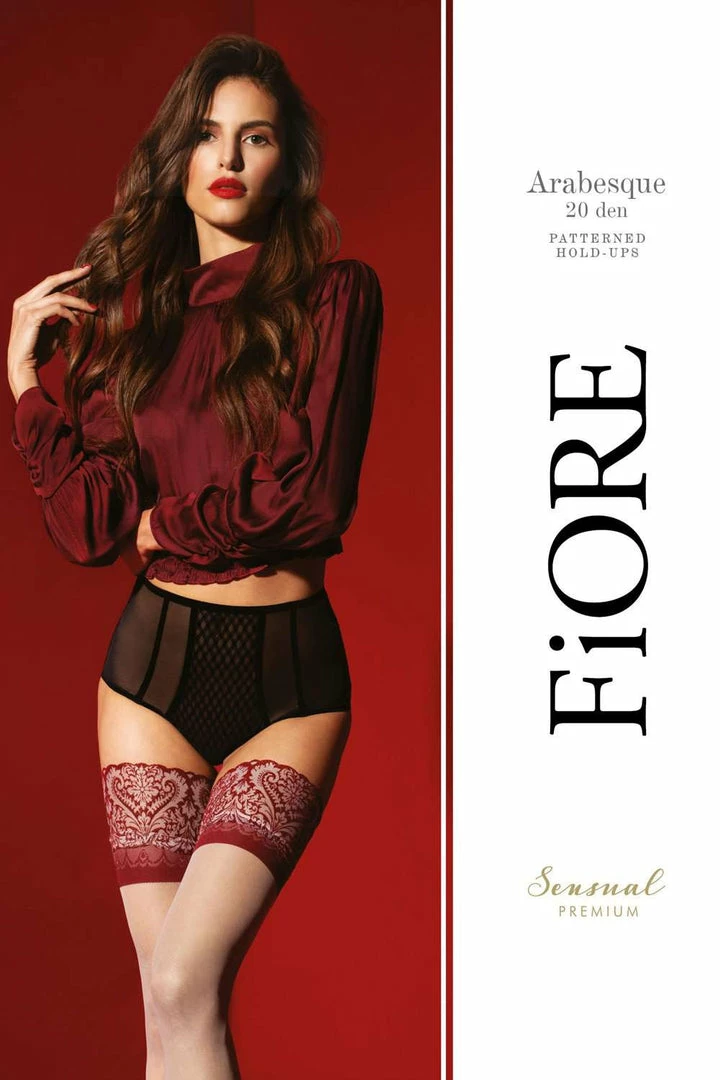 FiORE mixes carmine exotic patterns like an oriental dance on their Arabesque hold-ups. Think Persian style and beautiful mosaics in front of our eyes. The contrasting red lace welt combines perfectly with the sand-light desert hue. Designed for an exceptionally soft and smooth ‘silky touch’ finish, these sensual stay-ups will stay in place all day and evening thanks to their discreet silicone backing. Keep your pins on show and style yours with our range of bodysuits or lingerie sets.