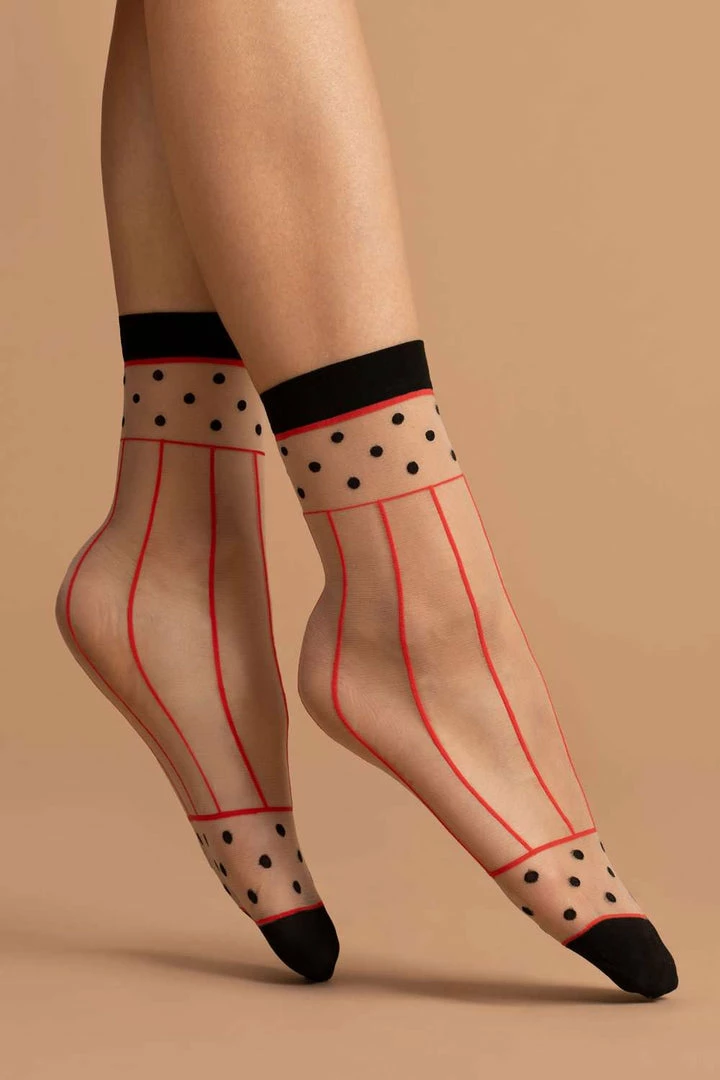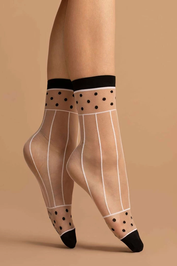 FiORE’s ‘Spicy’ Socks will appeal to women who love patterns. The sheer nude fabric looks stunning on bare skin. The bold contrasting pattern gives them an original character. Made from soft elastic fibres topped with comfortable cuffs. Style yours with your favourite heels or flats.
