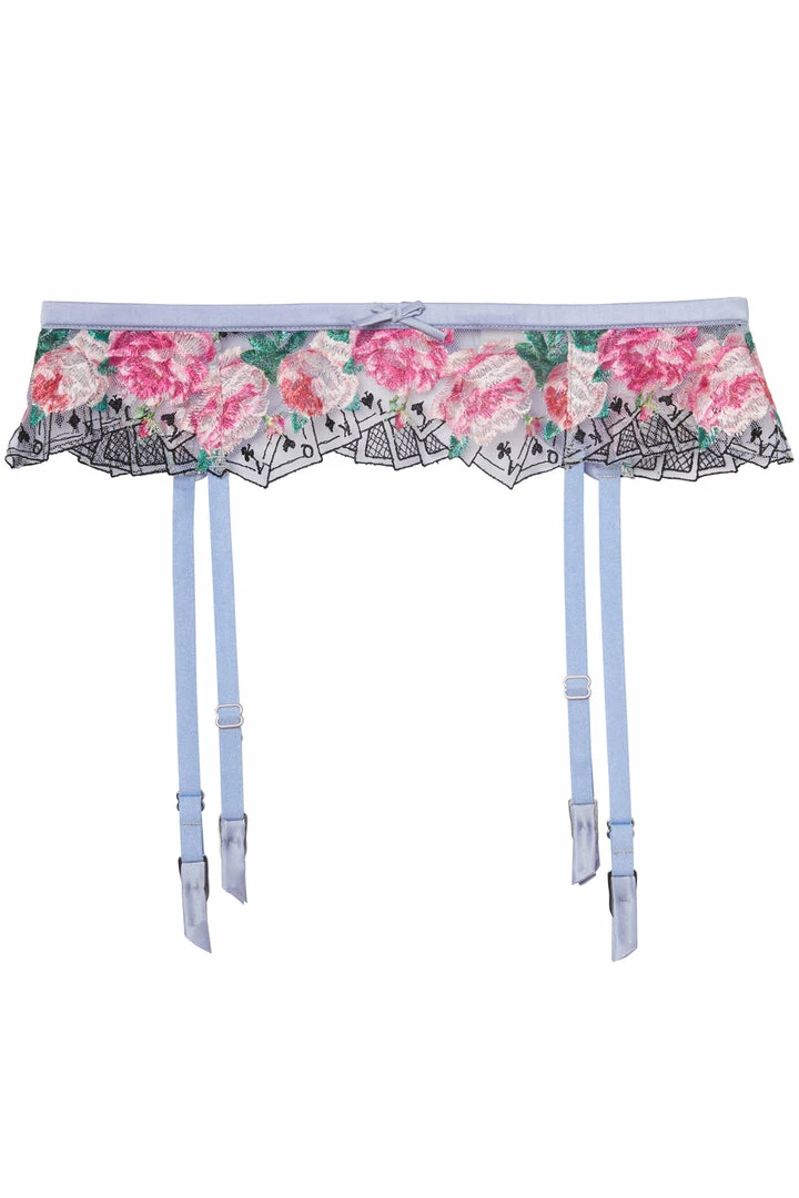 • Flirty suspender belt in pastel sky.
