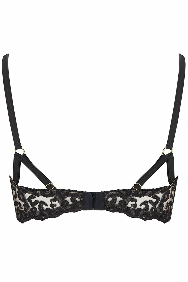 Adorn your bust with the finest British lingerie from Fleur of England. Bold and unapologetically sexy, the Kittie Strap Balcony Bra is expertly crafted in Europe from hand-drawn leopard embroidery, Italian tulle and luxurious silk. The sheer Italian tulle fabric on the cups and an underband offer a peek of skin beneath and elastic encased silk straps over the bust highlight every curve. The 24-carat gold plated hardware is the ultimate finishing touch to this luxurious black bra. Pair with the Embroidered Thong and Suspender Belt for a femme fatale look of pure seduction.