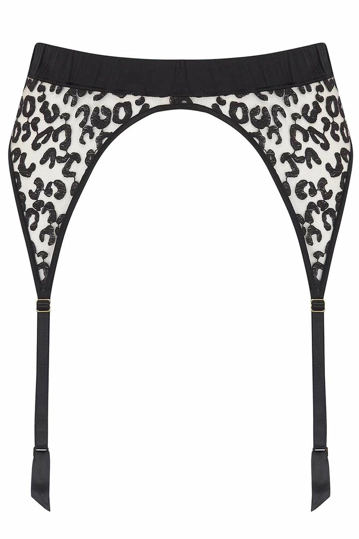 Indulge your love of beautiful embroidery with this sexy, 4-strap black suspender belt. The bespoke leopard print embroidered and sheer Italian tulle makes this piece a playful luxury lingerie staple while 24-carat gold plated hardware elevates this suspender belt to new heights of sophistication. The jet black silk encased waistband accentuates your waist and ensures a comfortable fit. A fiercely feminine piece that will add luxury and elegance to any black lingerie set.