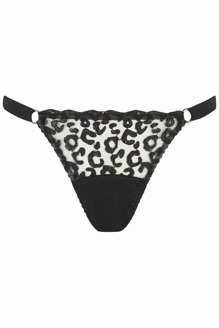 Playful and effortlessly elegant discover the Kittie thong by Fleur of England. This black thong features an exquisite bespoke leopard print embroidery on sheer Italian tulle at the front. The narrow elastic side straps and full back are made with encased silk for comfort and luxury. Finished with 24-carat gold plated hardware, this luxury thong can add a touch of glam to your everyday or make a seductive statement on special occasions. Create a bold statement with the matching Kittie Strap Balconnett bra and suspender.