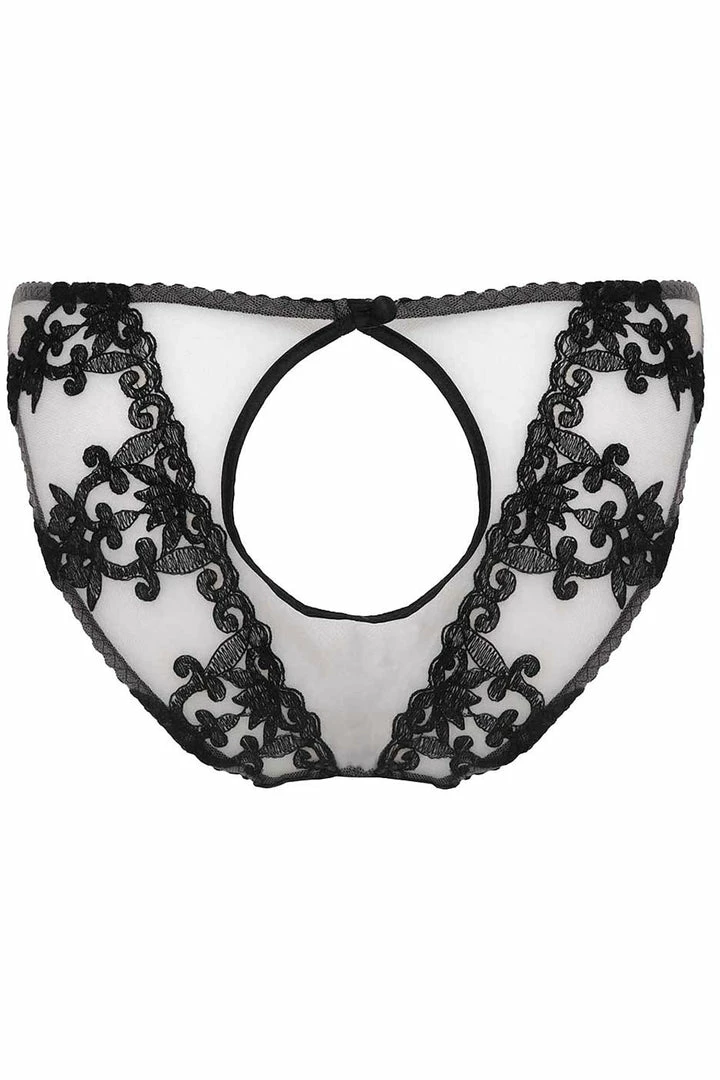 The Onyx embroidered ouvert brief is a sexy addition to the collection with a cheeky peep-hole detail at the back. Crafted in sheer tulle with a contrasting black embroidery design that adorns the front of the brief and frames the back for a sexy yet sophisticated look.