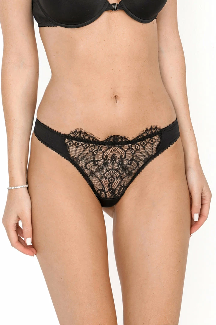 You’ve been looking for something sexy yet comfortable? Look no further than the French Connection thong! Made from black lace with eyelash trims and soft microfibre, it features a classic thong cut to the back and wide sides to enhances the female silhouette. Complete the sexy black lingerie look with the matching French Connection fantasy bra and suspender belt.