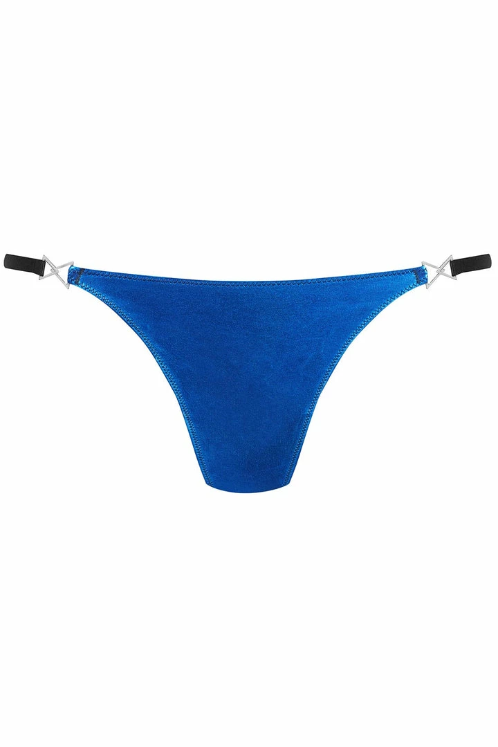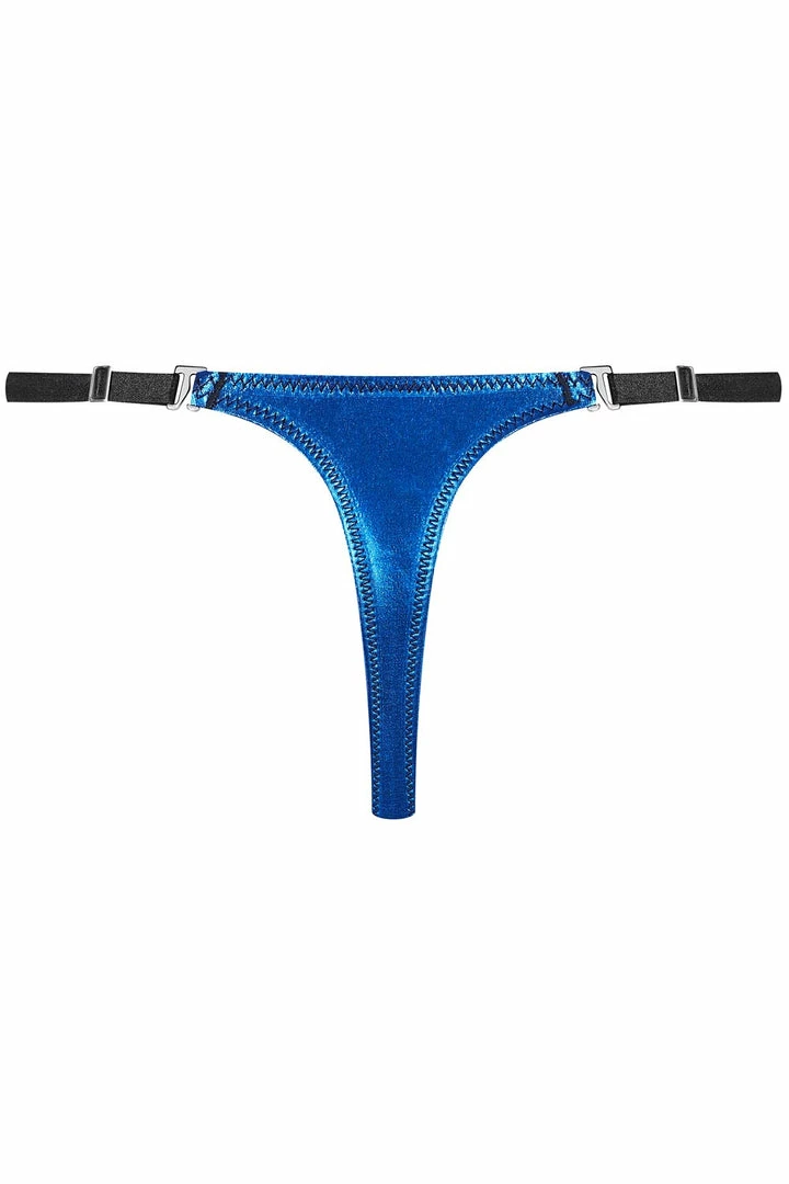 If you love bold blue lingerie, the Blue Angel collection from Maison Close is a must-have. This mini thong is made from soft metallic foil microfiber, it features elastic side straps that are removable and interchangeable. Wear this low-rise thong with the matching triangle bra or tank top for a luxurious lingerie look.