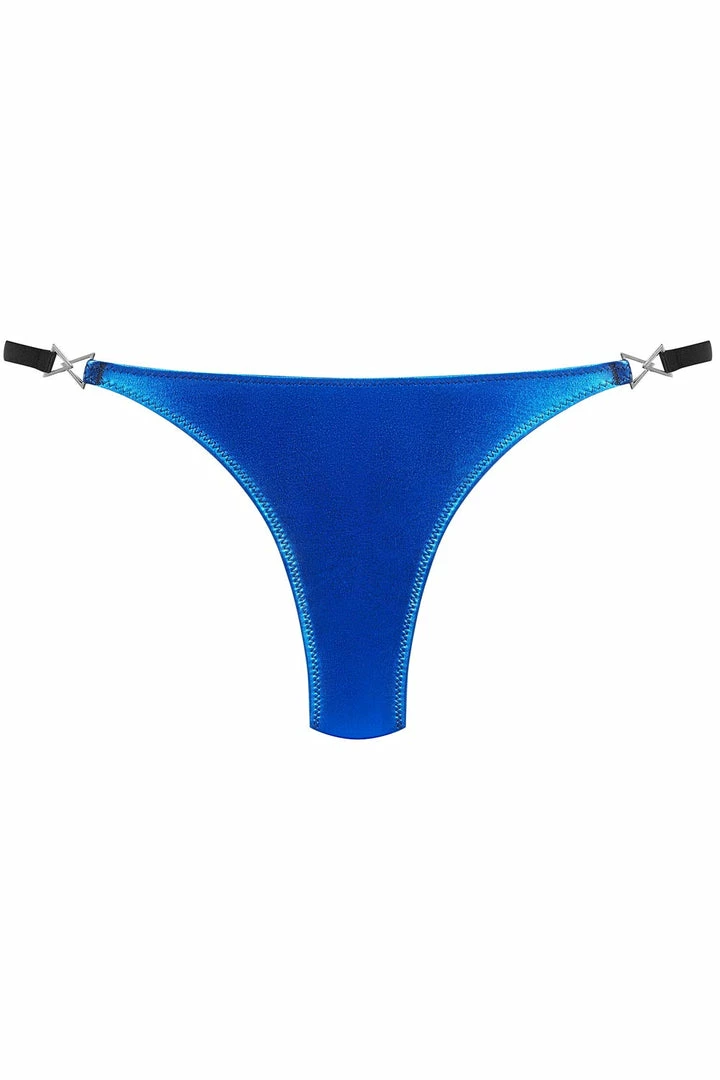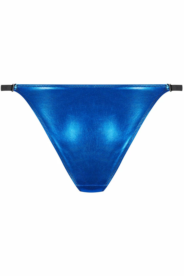 Sexy and chic, discover the Blue Angel strap brief by Maison Close. Made from metallic foil microfibre in a beautiful shade of blue that’s inspired by the Morpho butterfly, these low-rise brief highlights your curves with this brazilian cut. The elastic side straps are removable and interchangeable so you can mix up your look. Complete this luxury lingerie look with the matching Blue Angel trianglar bra.