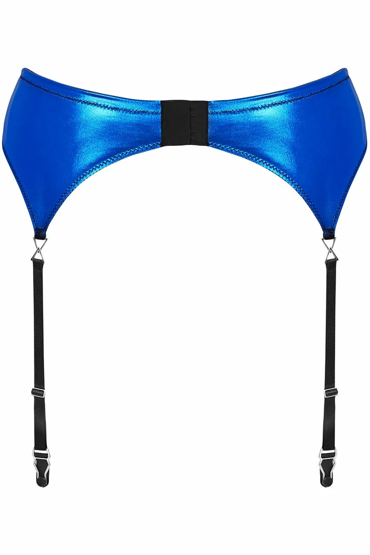 Add a touch of luxury to your lingerie collection with the Blue Angel Suspender Belt from Maison Close. Crafted from soft metallic microfiber panels that hug your hips, accentuating your waist perfectly. The 4 suspender straps are adjustable and interchangeable so you can mix & match your look. Style yours with the matching mini thong and triangle for a bold lingerie look.