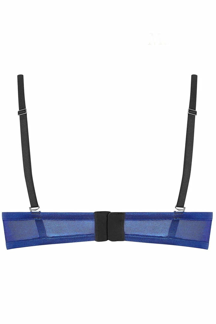Switch between playful seduction and sensational minimalism with this open cup bra by Maison Close. The open underwired cups and elastic strapping have an irresistibly sexy framing effect. The triangular hardware at the top of the cups allows for the straps to be detachable so you can match your look with different colour shoulder straps. Style yours with nipple pasties and the matching Blue Angel knickers for a sensual lingerie look.