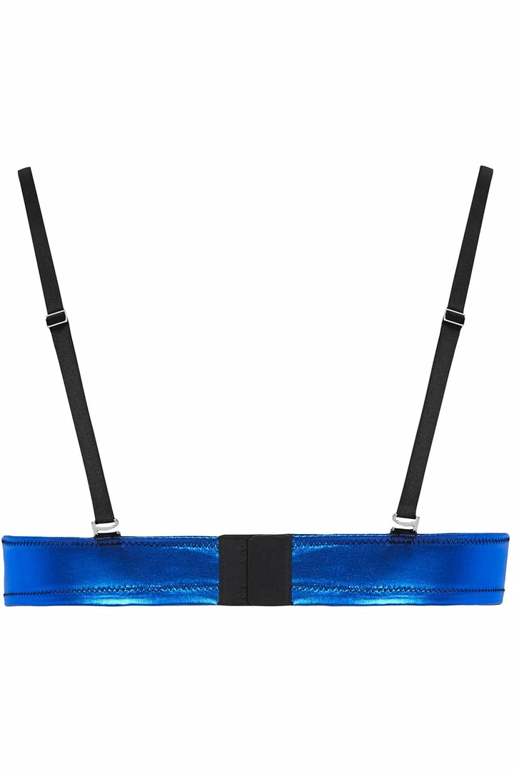 Maison Close’s ‘Blue Angel’ triangle bra is made from metallic foil microfiber in a beautiful blue. Free from padding and wiring, it has a flattering v neckline, an adjustable underband and triangular cups with bust darts for support. The thin shoulder straps are both adjustable and interchangeable so you can twist up your look. Style yours with the matching Blue Angel knickers for a sensual sheer lingerie look.