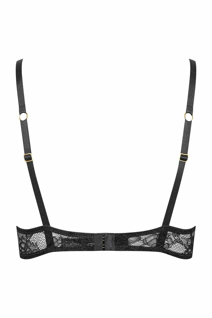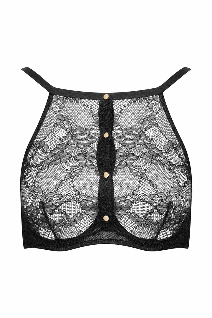 Lace lingerie from Maison Close. Discover the sublime halter neck bra from Le Petit Secret Jeux Magnétiques collection. All in black lace this seductive bra features underwired cups which shape and lift the breasts whilst ensuring both comfort and support. The bust is partially visible through transparent delicate floral lace whilst four magnetic buttons add an erotic touch.