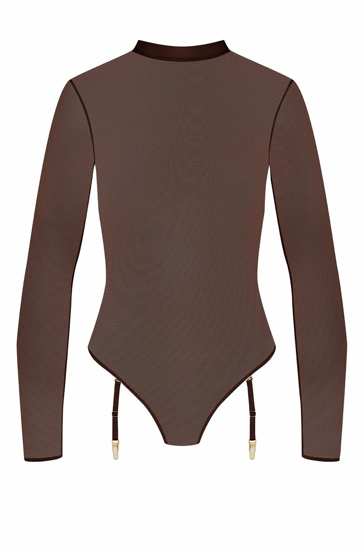 Maison Close’s ‘Corps à Corps’ bodysuit is not only designed to flatter a women’s natural curves but also enhance her playfulness. Cut from satin tulle in a delicious chocolate colour, this sheer bodysuit has a high neckline, long sleeves and figure-hugging cut. The body comes with two sets of suspenders, chocolate for a monochrome style and neon orange for a playful twist. Style yours with our selection sheer stockings.