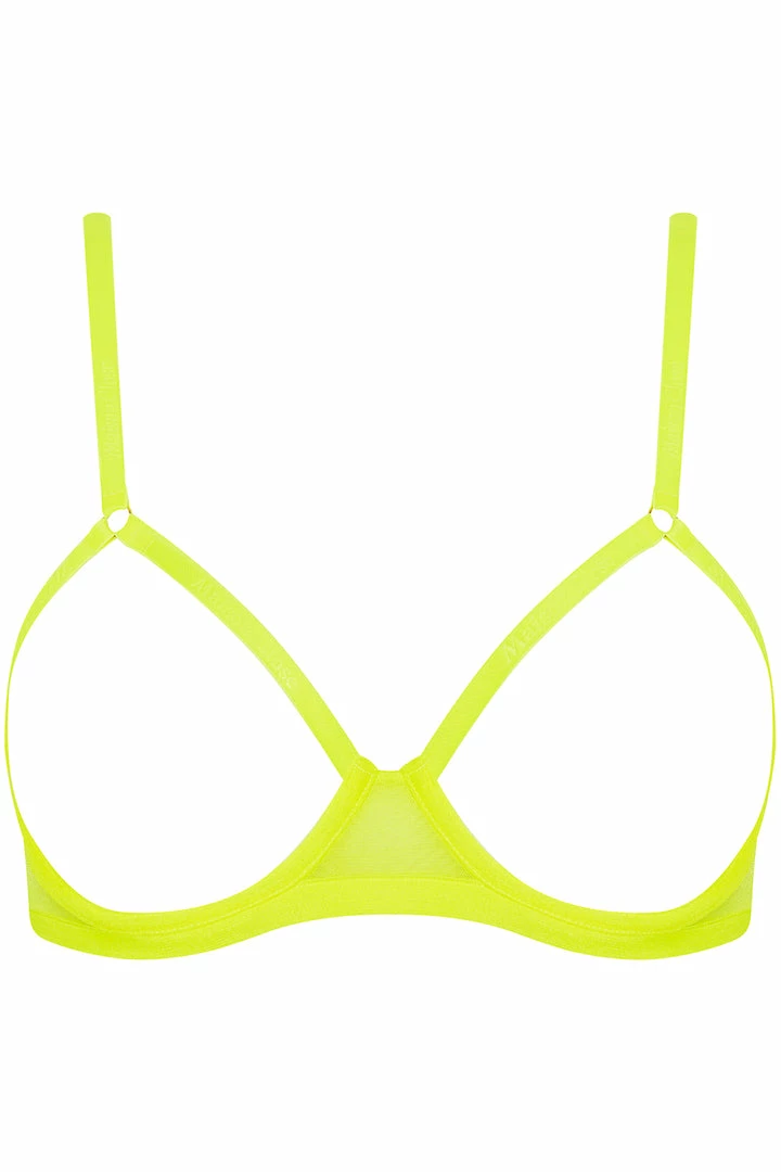 Switch between playful seduction and sensational minimalism with this neon yellow open cup bra by Maison Close. Taking its cue from bondage fashion, the underwires and elastic strapping have a framing effect – it’s not the bra that’s the main attraction here, it’s you. Style it with the matching thong or brief for a bold neon lingerie look.