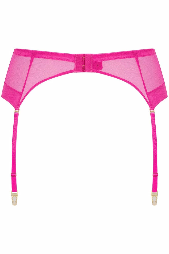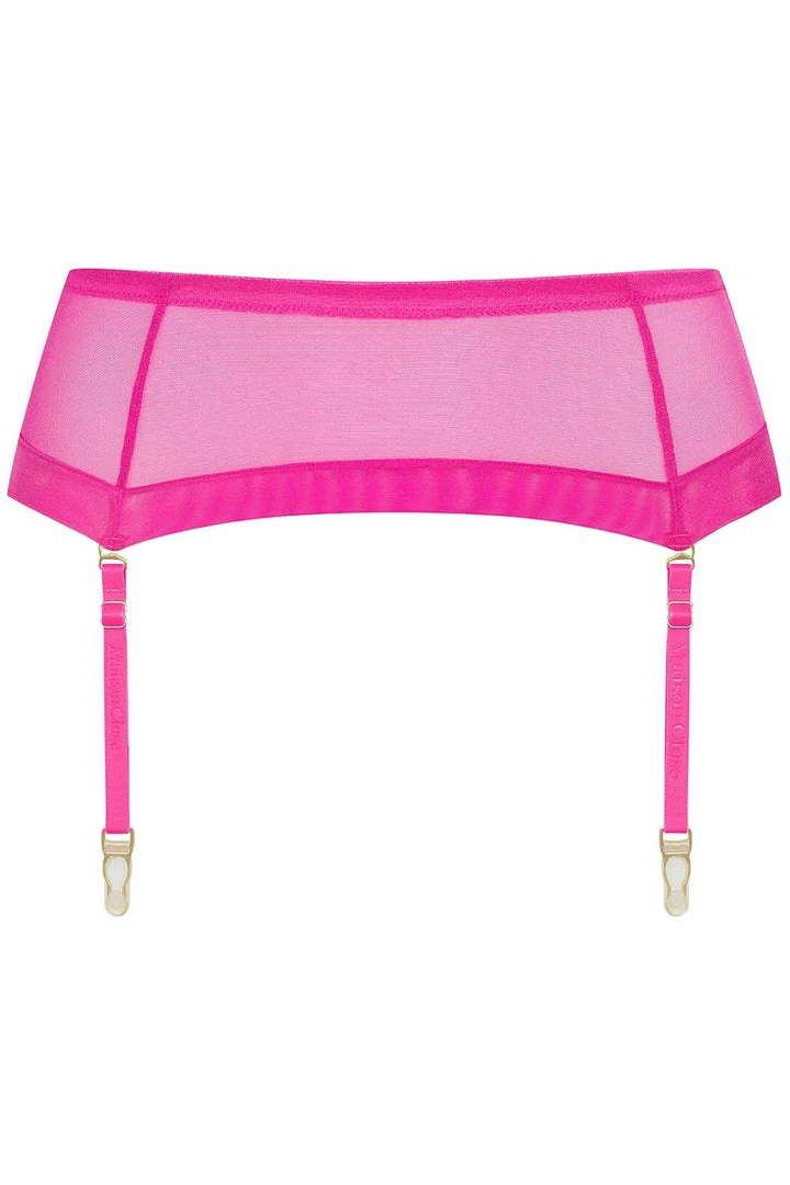 Add a touch to your lingerie collection with the Corps à Corps Neon Suspender Belt from Maison Close. Crafted from sheer tulle panels that hug your hips, accentuating your waist perfectly. The bright neon pink fabric has a shiny finish and provides a second-skin effect. The 4 suspender straps are adjustable and interchangeable so you can mix & match your look. Style yours with the matching mini thong and triangle for a bold lingerie look.