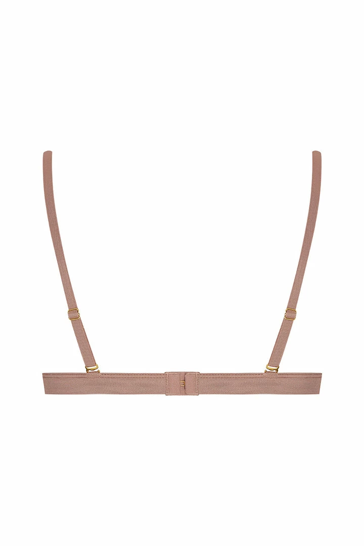 Maison Close’s ‘Corps à Corps’ wireless bra is made from lightweight satin tulle in a warm taupe colour. Free from padding and wiring, it has a flattering v neckline, an adjustable underband and triangular cups with bust darts for support. The thin shoulder straps are both adjustable and interchangeable so you can twist-up your look with the ginger snap, pink or one of each colour for a playful look peeking through of sheer top or dress. Style yours with the matching mini thong or brief for a match made in heaven.
