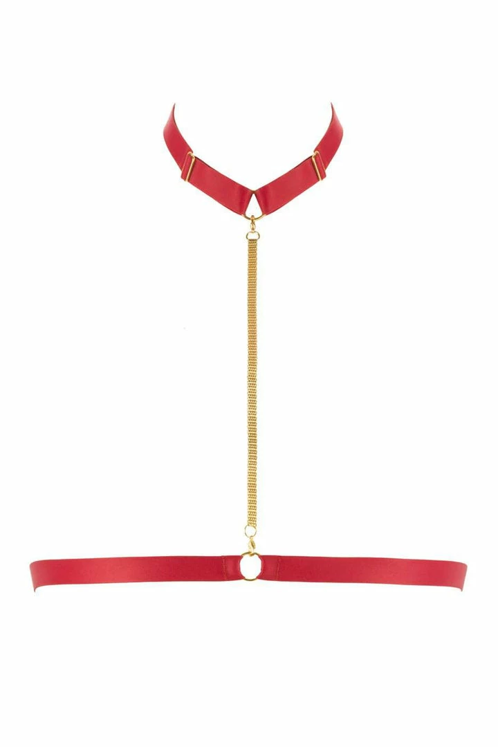 Red lingerie from Maison Close. Dare to bare with this eye-catching red harness. The harness features stunning gold detailing and is fully detachable to wear alone as a collar or belt.