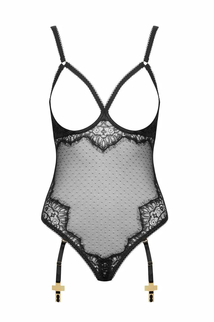 Risque lingerie from Maison Close. Elegance and statement style come together in the Inspiration Divine collection. This sensual bodysuit frames your hourglass figure with luxurious dotted tulle & delicate lace. Whilst the open cups creates drama & sets the mood. Complete the look with the matching seamed stockings or sheer hold-ups for an elegant look.