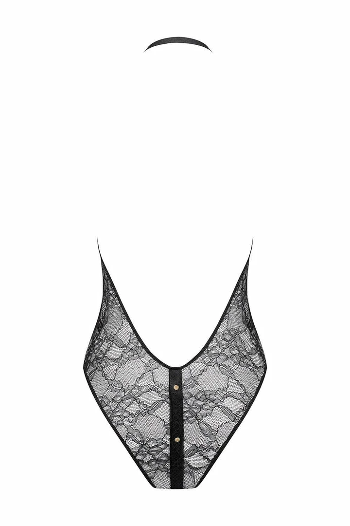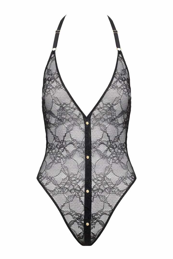 Risque lingerie from Maison Close. Sexy and elegant discover the panty body from Le Petit Secret Jeux Magnétiques collection. This tempting bodysuit features an elegant floral lace, magnificent plunging neckline and openable design. The adjustable halterneck strap leaves the shoulders and the back bare. Style with sheer hold-ups for a tempting look.