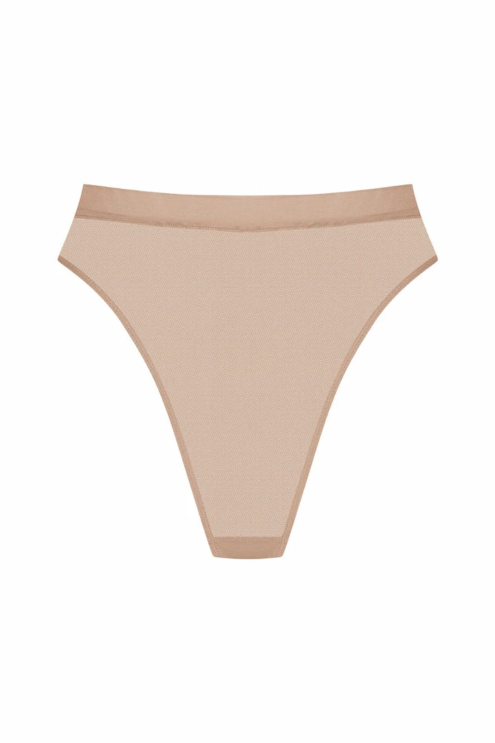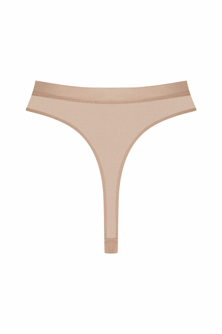 France-based brand Maison Close has been making rich and sensual lingerie without neglecting comfort since 2006. This sheer thong is no different, it’s cut from sensual satin tulle in a warm nude colour. The delicate fabric has a shiny finish which looks naturally radiant on bare skin. They have a flattering high-rise elasticated waistband and a high leg cut which creates the illusion of slimmer, longer legs. Style yours with our range of nude hold ups the matching triangle bra and mini dress.