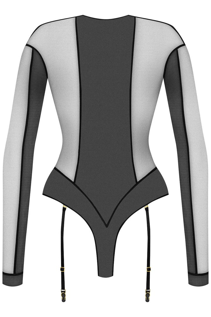 Indulge in luxury with the L’Amoureuse bodysuit from Maison Close. Crafted from sheer black mesh this luxury body features multiple seams and lined mesh to shape the silhouette. The suspenders are adjustable to allow for your desired fit or they can be removed for multiple looks. Its v neckline, long sleeves and fitted design showcase your curves to perfection.