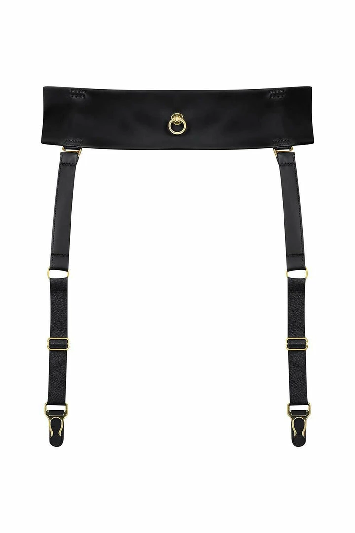 Leather-look lingerie from Maison Close. Inspired by “fetish chic”, the sublime suspender belt from the Chambre Noire line is crafted from leather-look fabrics and contrasting gold hardware. A golden fetish ring adorns the centre front and gives this showstopper a little something special. Incredibly soft fabric add to the fierce sexiness to this luscious leather-look belt. Featuring adjustable and detachable straps so you can wear it as a belt, waist cincher or suspender belt. Spice up your love life and wear it with the matching mini thong and nipple covers.