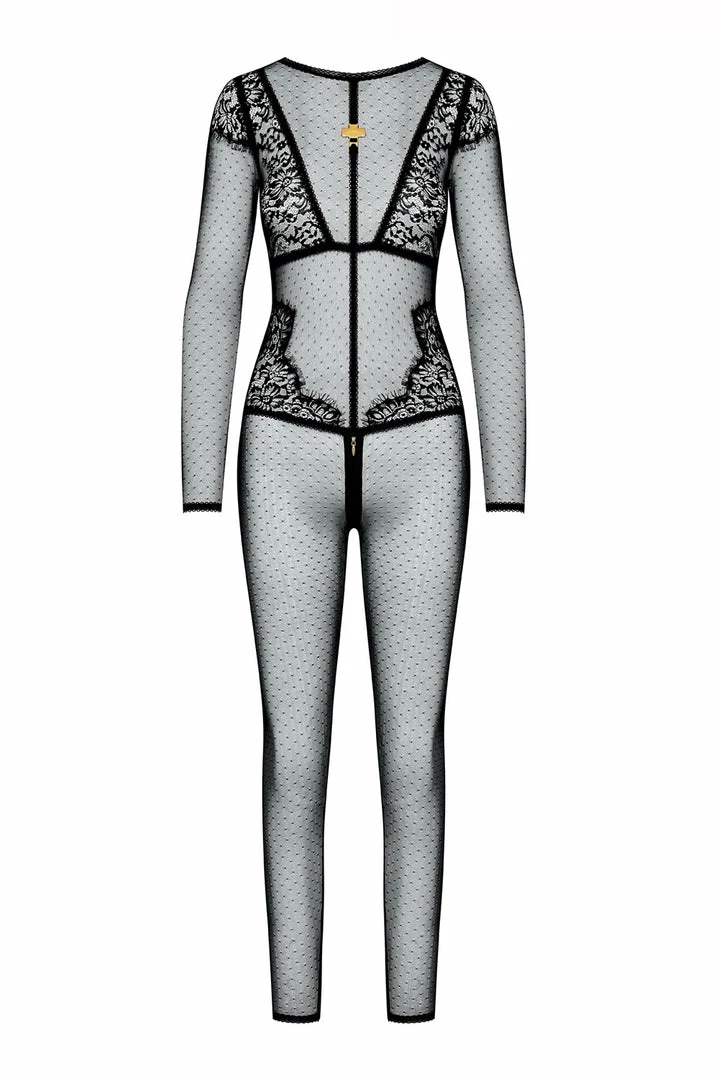 Since 2006, Monsieur Le Français’ styles inspire a new impulsion to high-end erotic lingerie. Imagining rich and sensual pieces to glorify women so it’s no surprise catsuits continue to be featured as they spotlight the female figure so beautifully. Made from sheer plumetis tulle and delicate eyelash lace inserts, this style has a sleek round neckline, body-hugging fit and zip opening to the crotch. True to the collection it features a gold-tone cross and buttons.