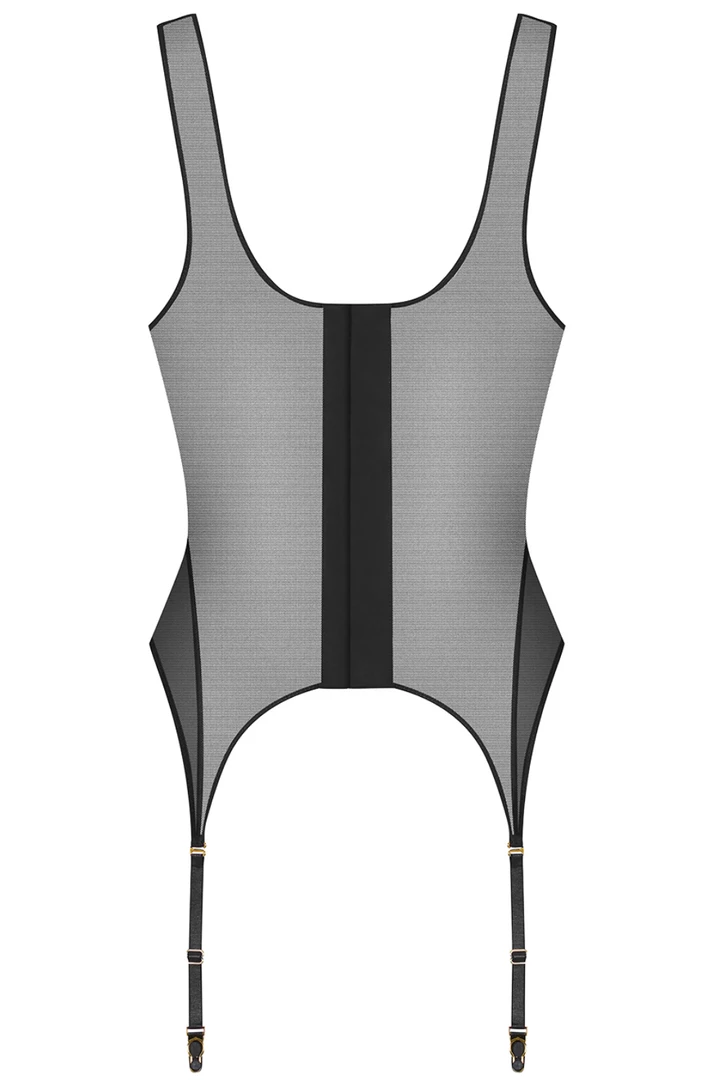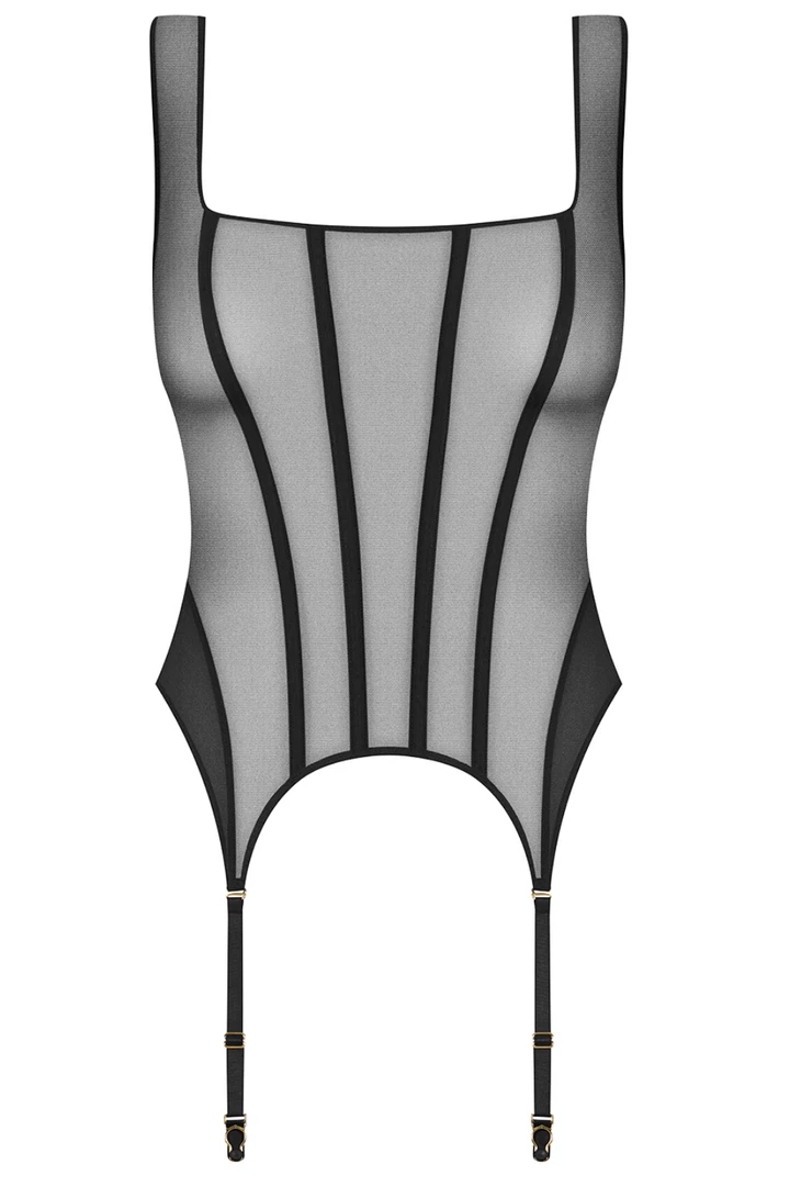 The L’Amoureuse Corset Top is the perfect combination of provocative and sensual. Crafted from ultra-sheer black mesh, it forms your figure with vertical seams. The 4 garters are both adjustable and detachable for your desired fit and look. Pair yours with the matching Nylon Stockings and L’Amoureuse Mini Thong.