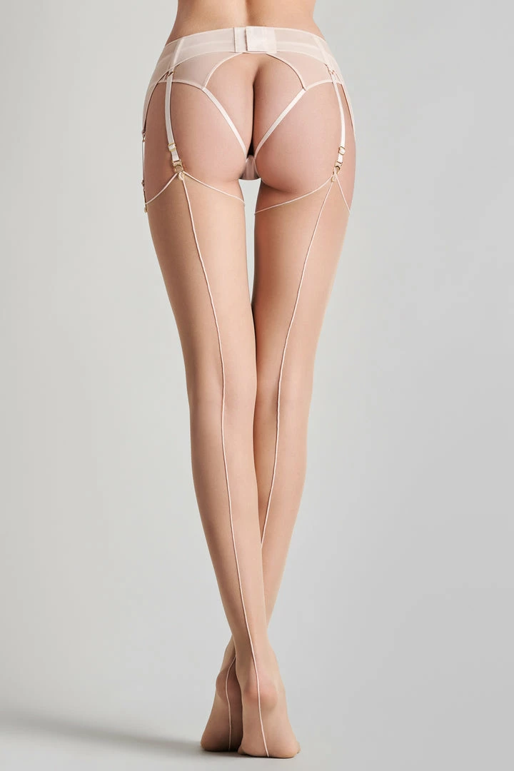 Add a touch of colour to your hosiery collection with Maison Close’s cut and curled seamed stockings. Made from 20 denier voile they smooth and highlighted the leg perfectly. Contrasting pink seams draw attention to your legs, elongating and slimming them.